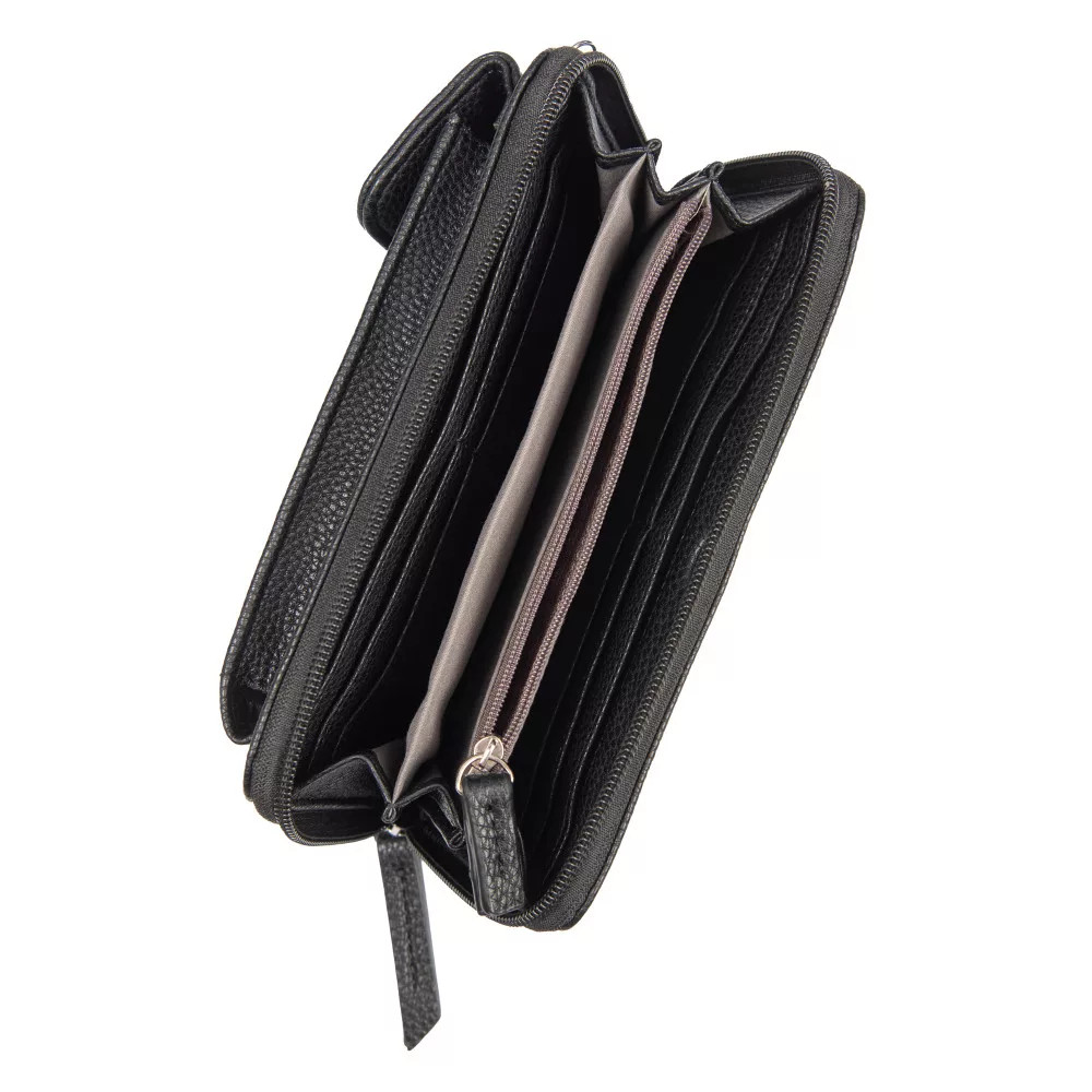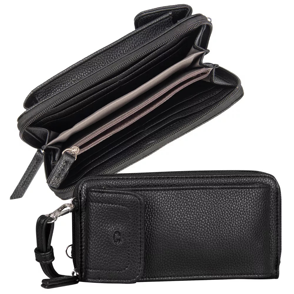 puha női pénztárcaelején patentos mobiltartókörbe cipzáras fő rekesz3 rekeszes belülegy cipzáras aprótartó2 rejtett zseb belül8 db kártyatartó belülkézben és keresztben hordhatóvállpántja állítható Szé:20 x Ma:10,5 x Mé:4 cm