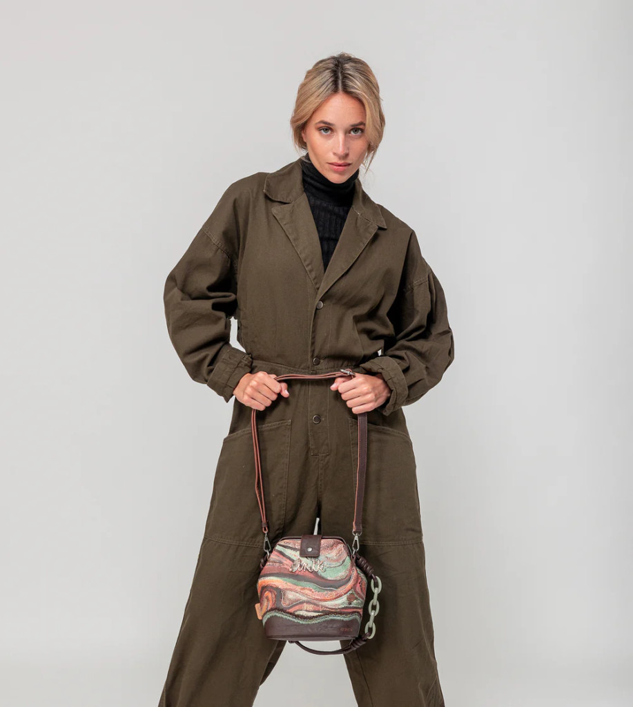 Készen állsz egy utazásra a Föld középpontja felé az Anekke Core-ral? Az Anekke Core tisztelgés Inge Lehmann dán szeizmológus előtt, egy jelentős tudós előtt, aki bebizonyította, hogy a Föld 4 rétegből áll, és hogy a közepe (a Mag) folyékony és szilárd. A kollekció minden egyes termékét ezen rétegek egyike ihlette. Ez a termék a Külső vonal része, amely a Föld második legmélyebb rétegét képviseli. Ez a réteg a Föld rétegeit ábrázolja különböző formákon, színeken és textúrákon keresztül. A barna, vöröses és zöld árnyalatokat különböző effektusok, például steppelések, dombornyomások vagy hímzések keltik életre, létrehozva azokat a formákat, amelyek teljesen elmerítenek az expedícióban.
