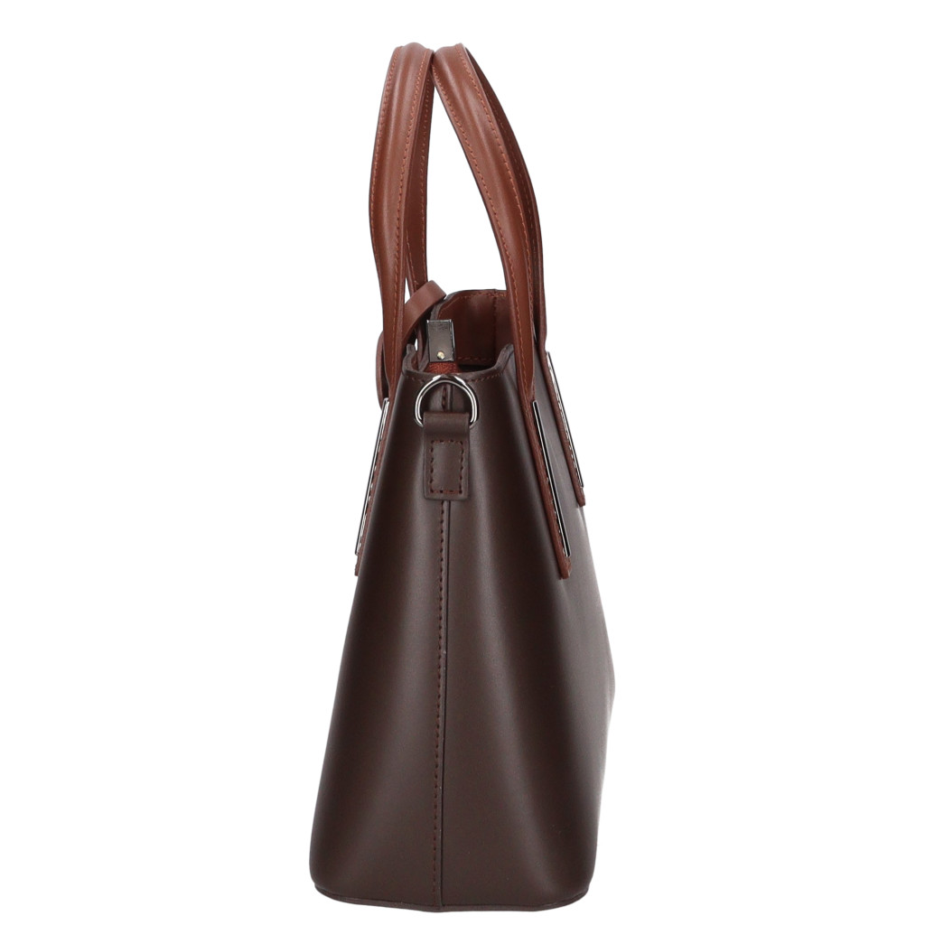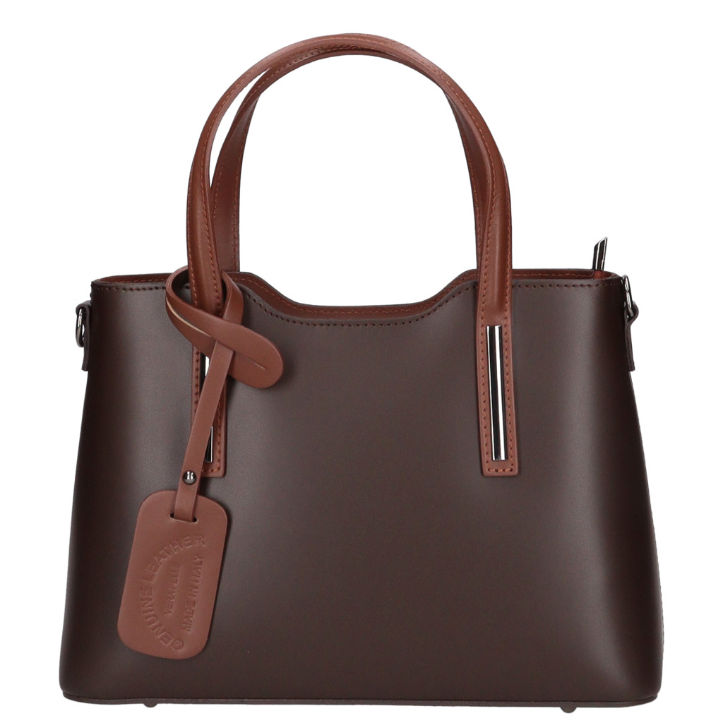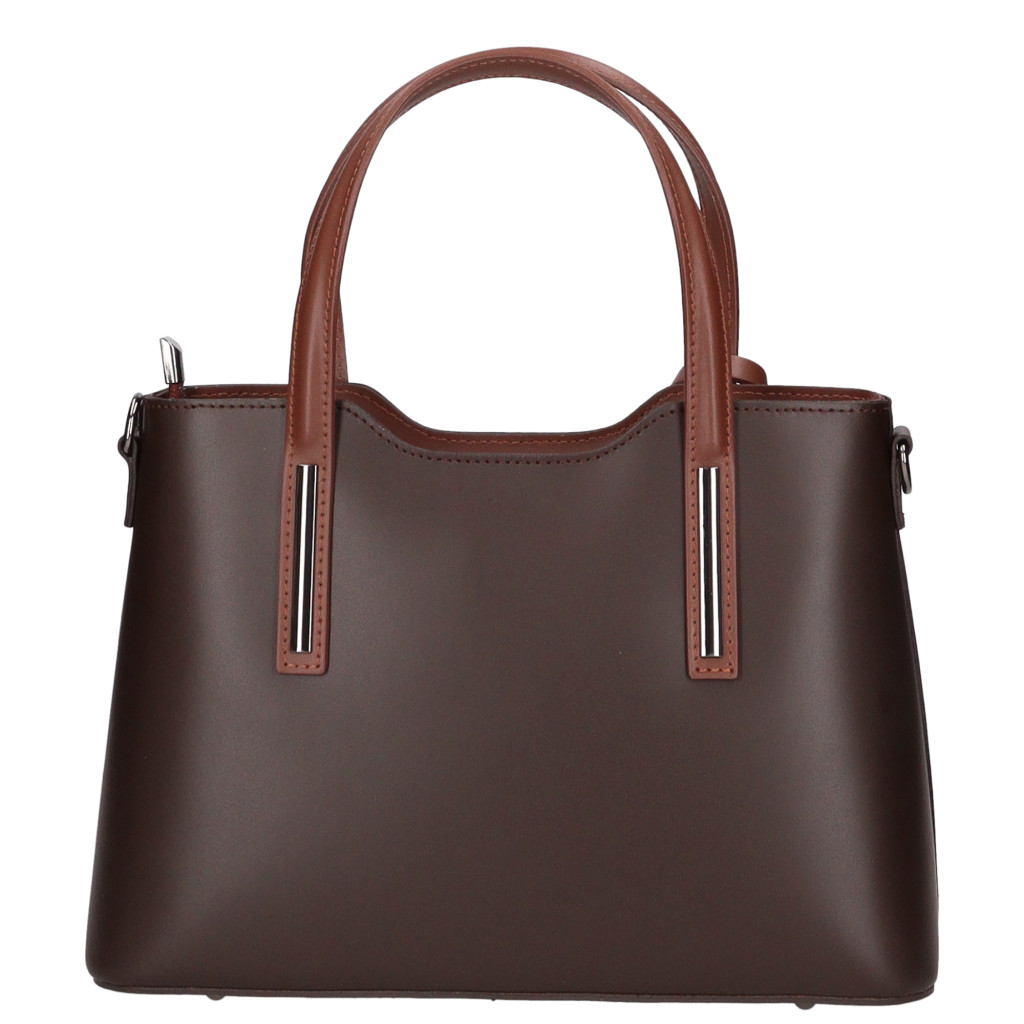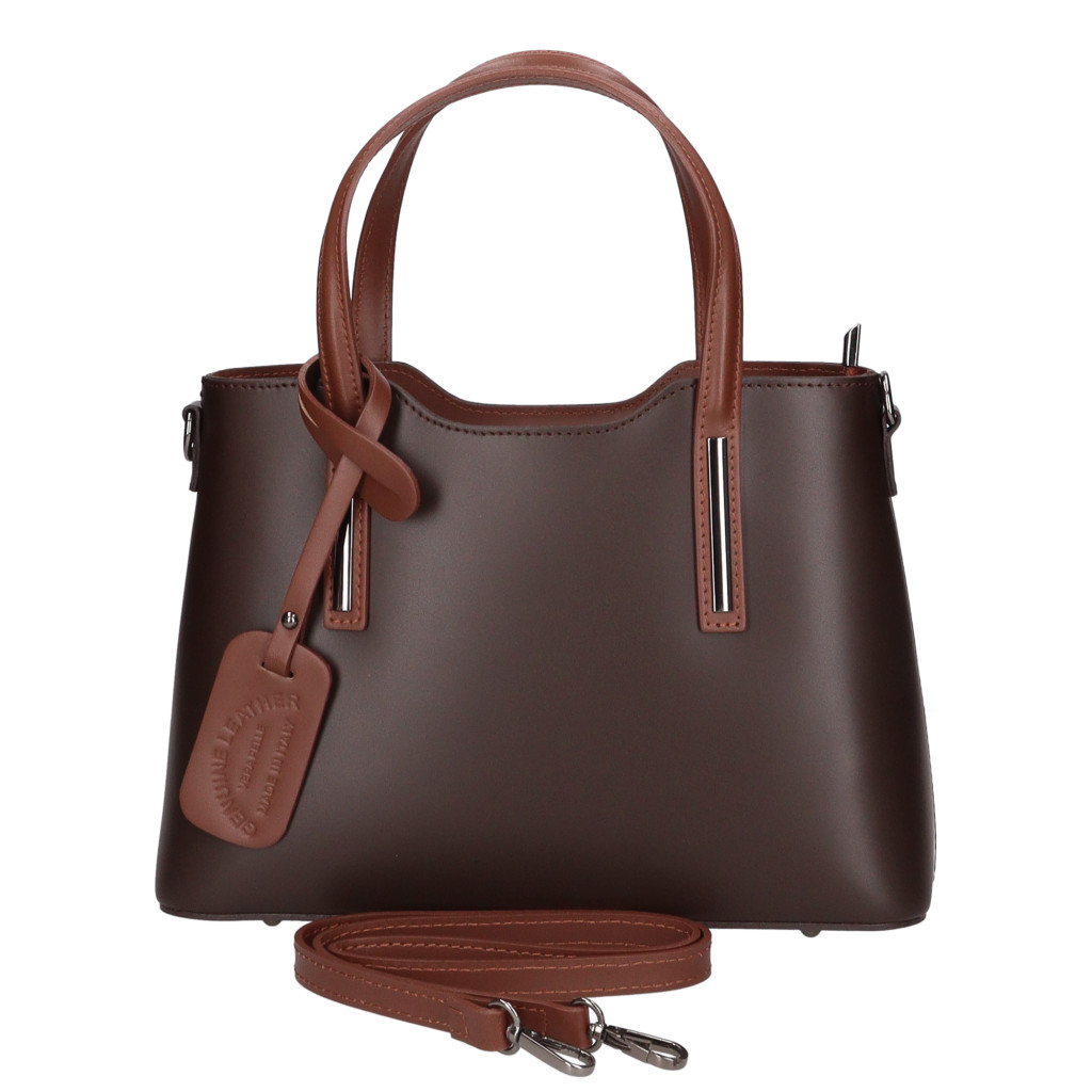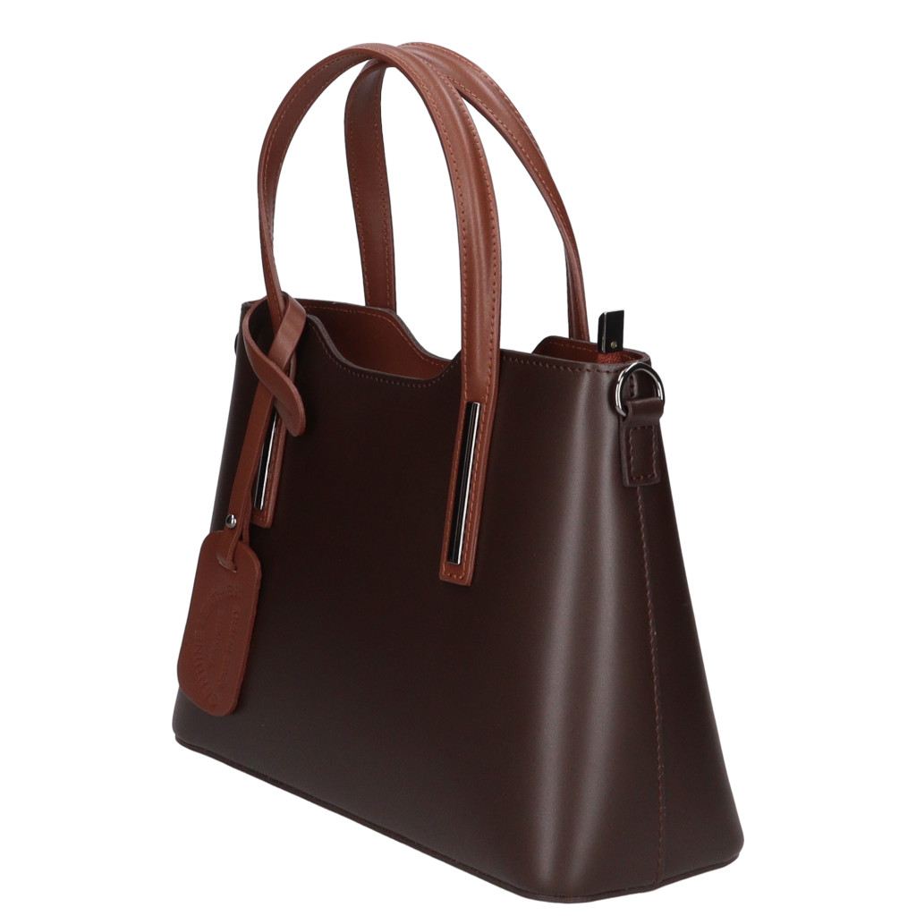 Olasz bőr női kézitáskaelegáns fazonelején lógó díszkézbefogóján ezüst díszítésbelseje osztottközépen cipzáras elválasztóvalkézben és vállon hordhatókézbe fogója 30 cmvállpántja állítható 60-90 cmSzé:32x Ma:22x Mé:13 cm