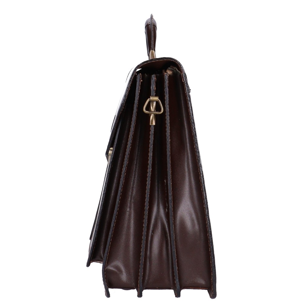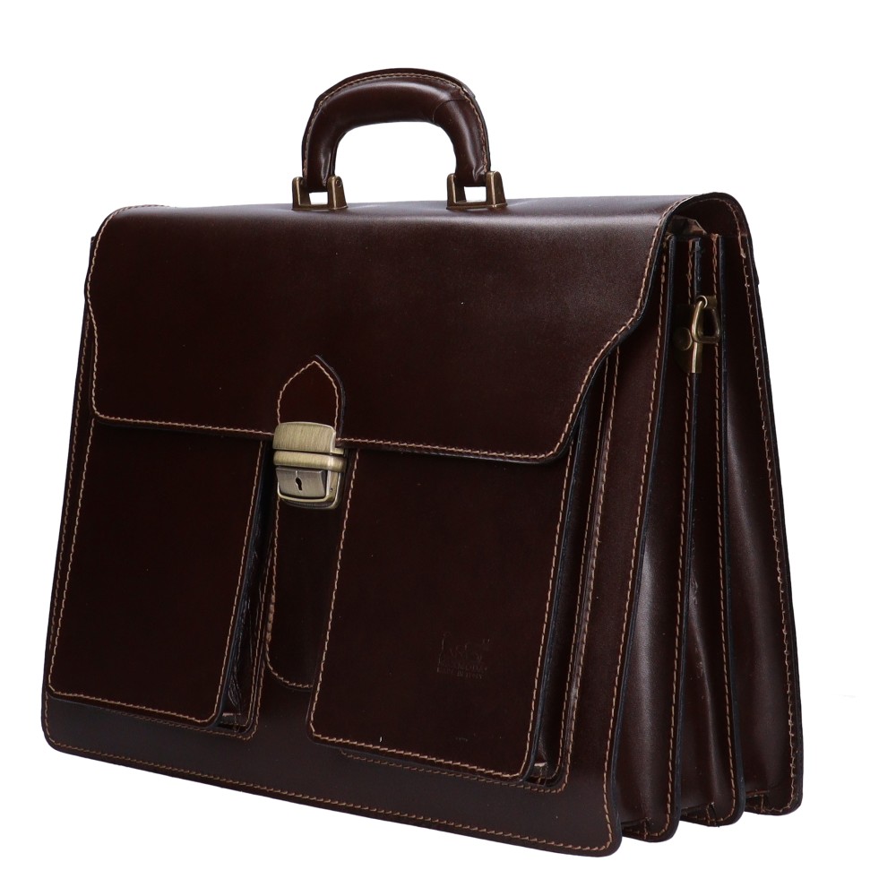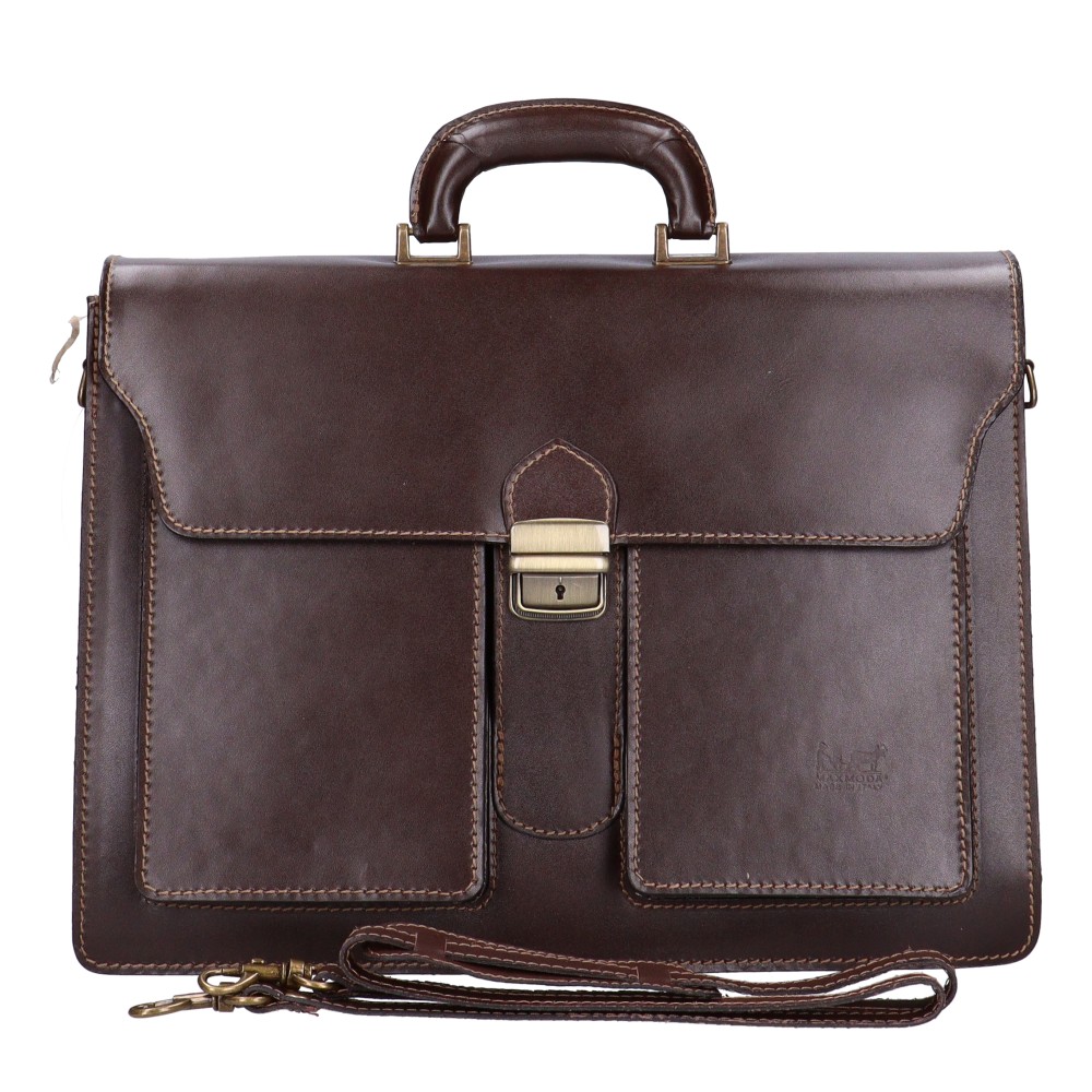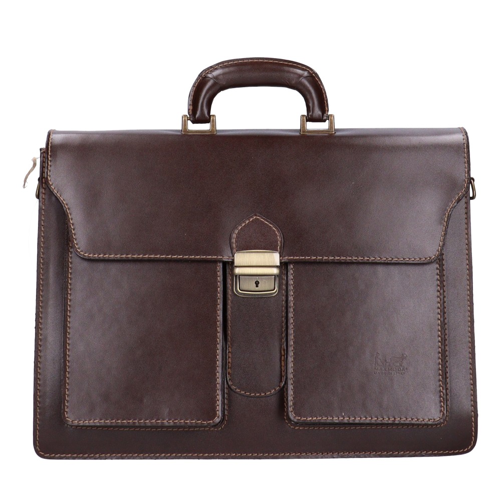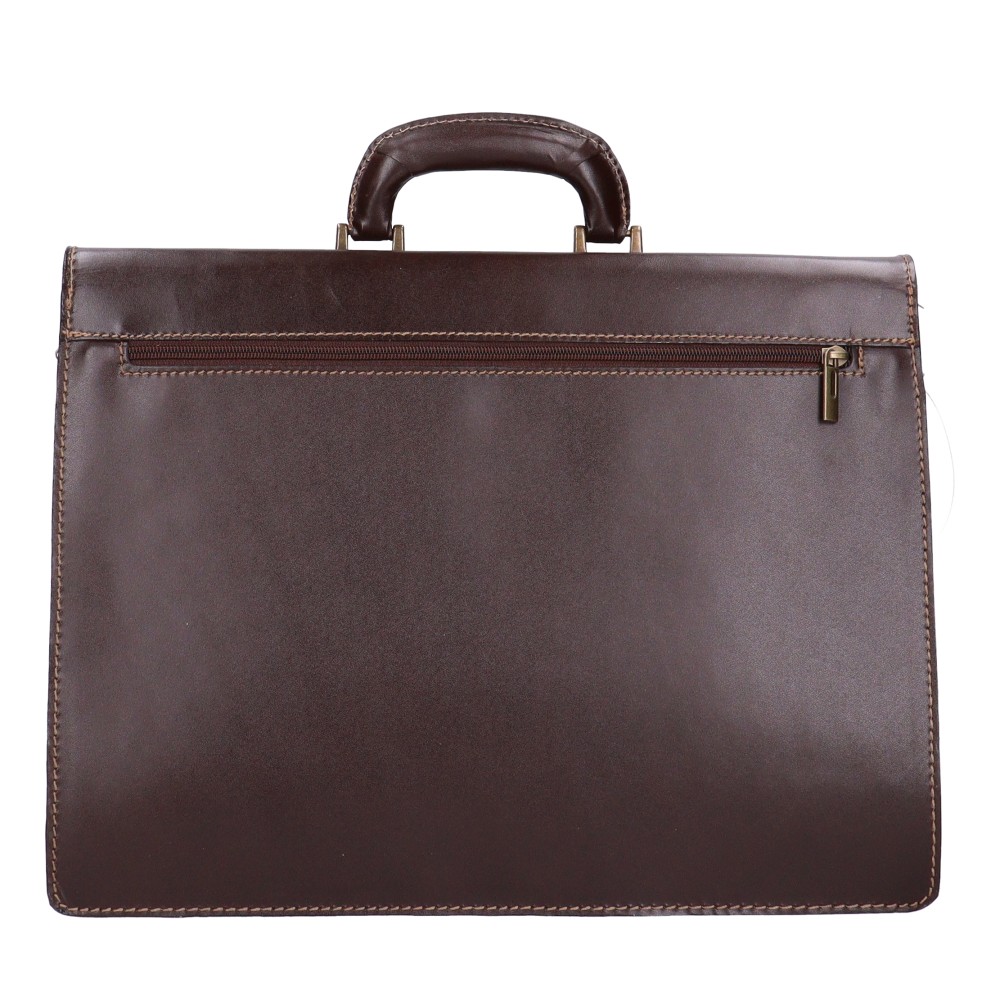 Valódi bőr férfi nagy aktatáskakiváló minőségű bőrbőlhátulján nagy cipzáras zsebelején 2 nagy zsebelöl csattal záródó fedélbelső borítása műbőrbelül 3 rekeszeskézben és vállon hordhatóvállpántja 80-130 cmSzé:40x Ma:29x Mé:14 cm