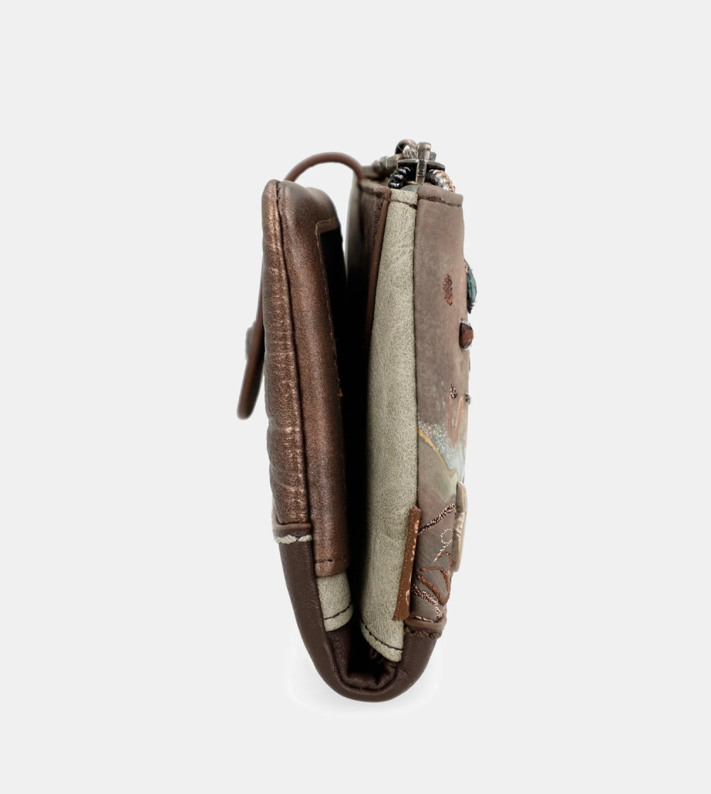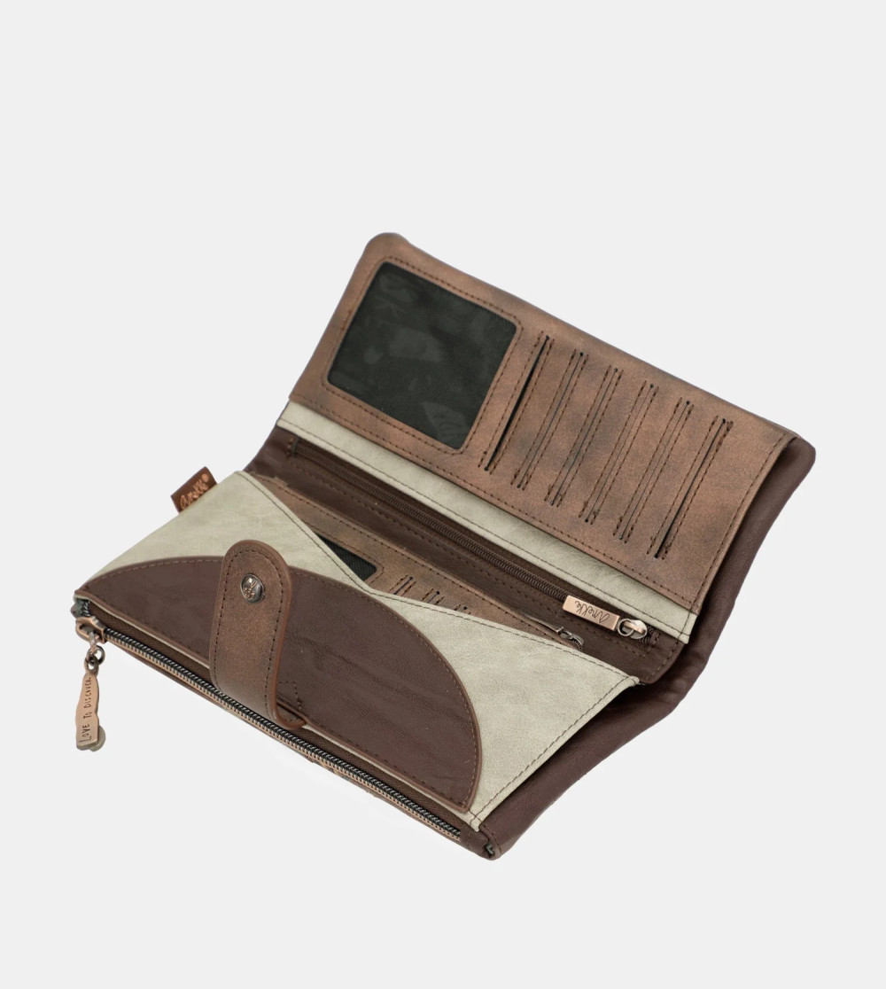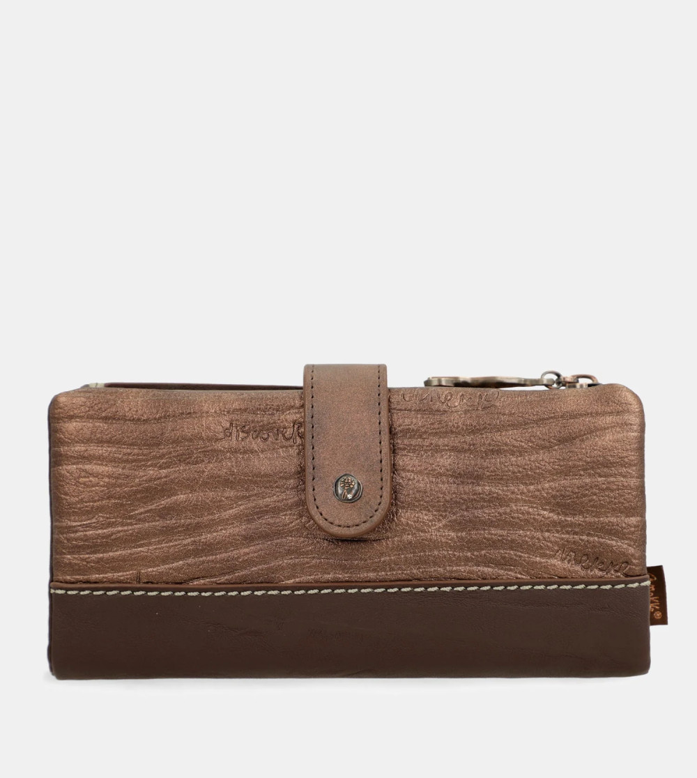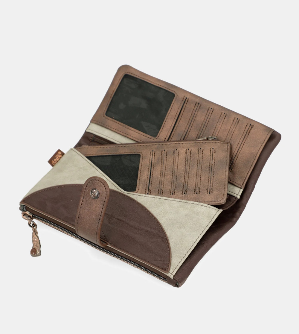 Ez a nagyméretű pénztárca rugalmas anyagból készült. Két fő rekesze van: hátul, ahol egy nagy pénztárcát és helyet találsz a számláknak és/vagy a kártyáknak. Felül cipzáros, belül pedig érméket tárolhatsz. Az egész belső tér bélelt. Ezen kívül van benne egy kivehető kártyatartó is.