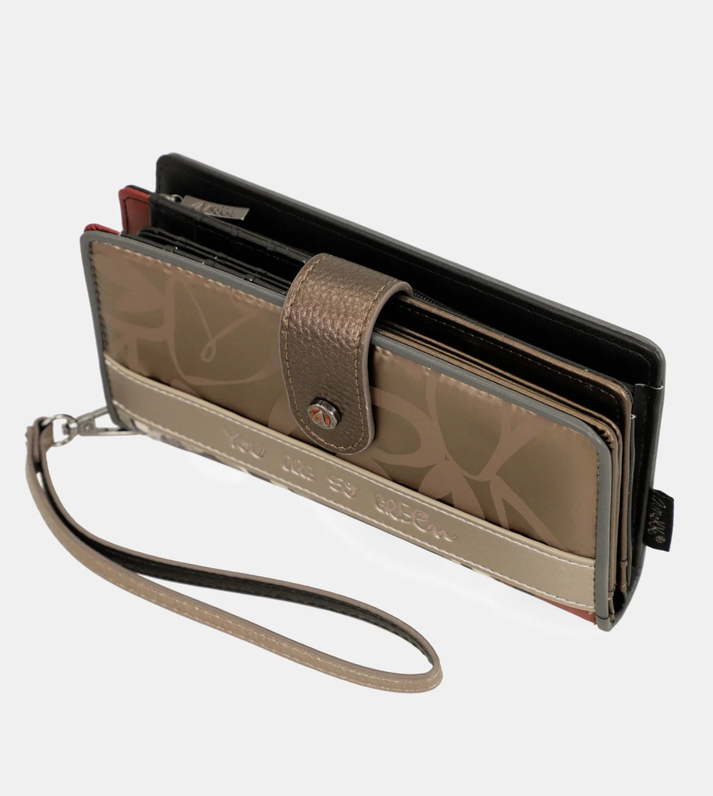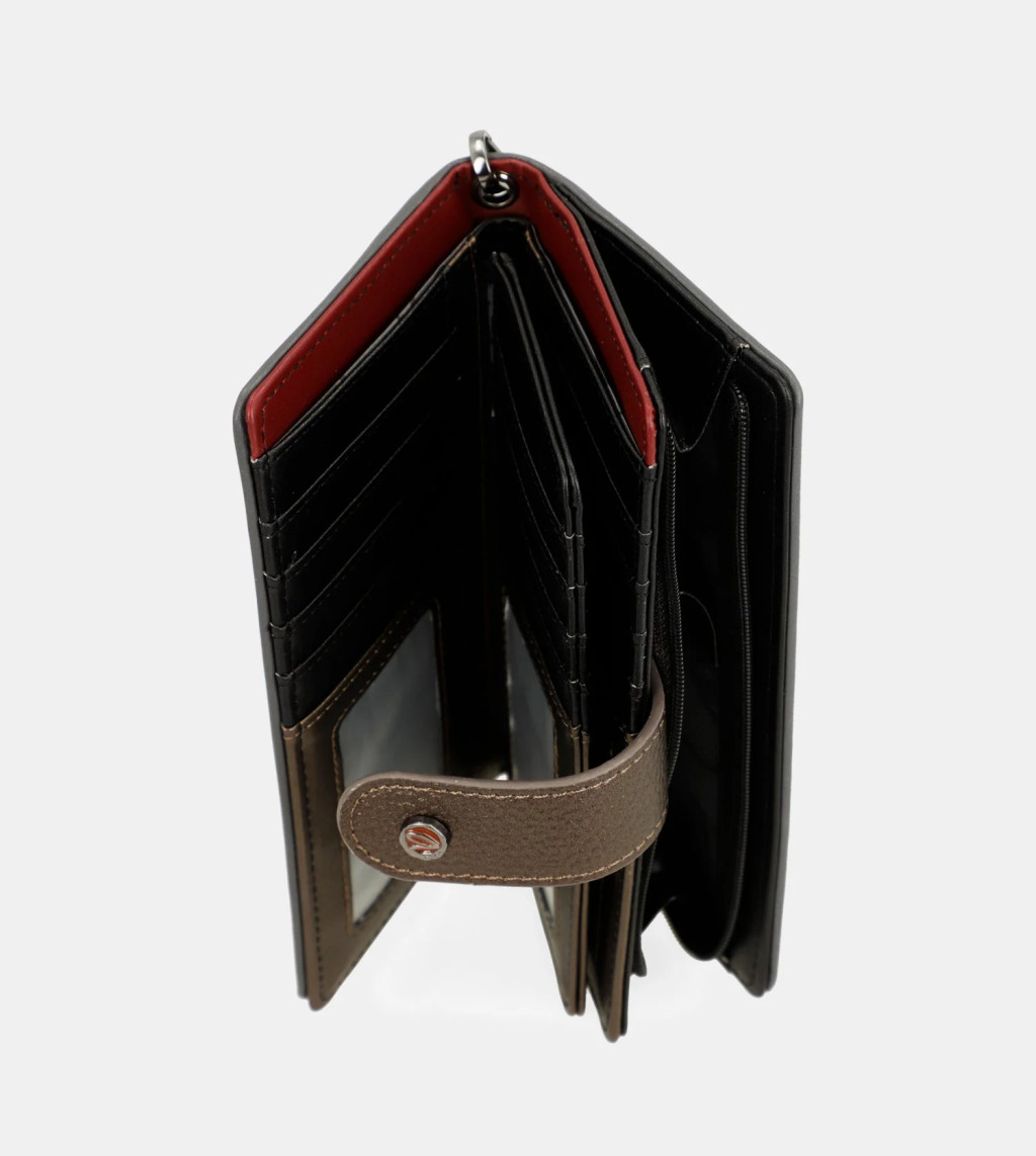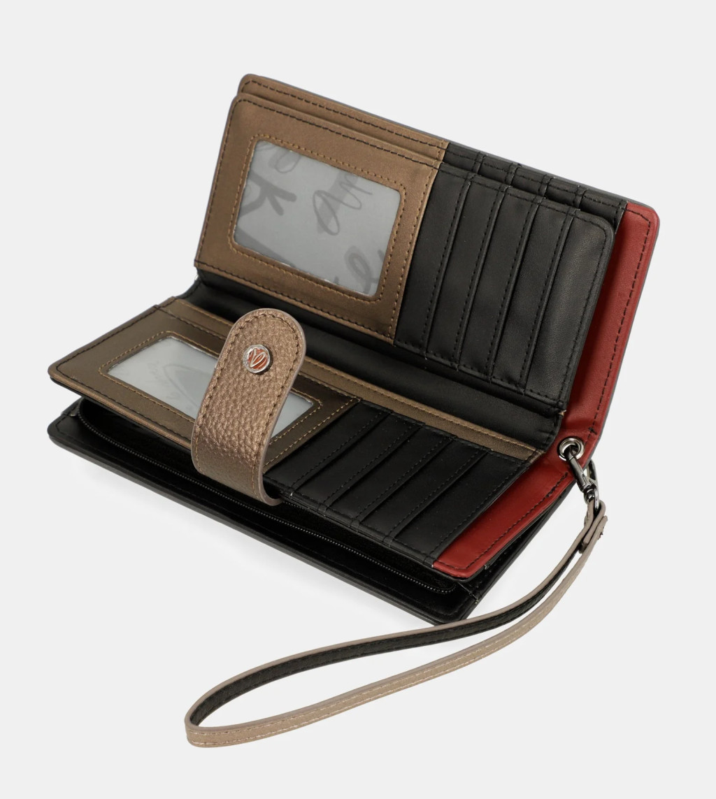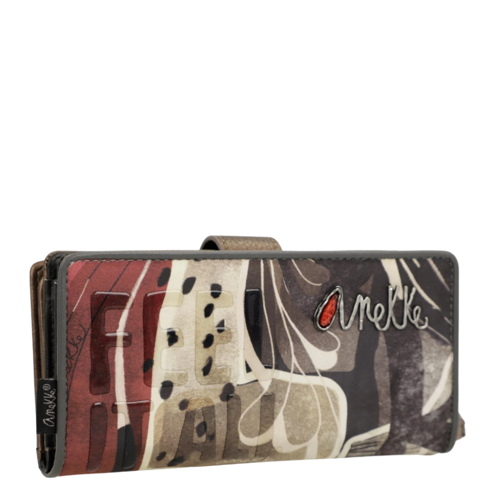 Anekke pénztárcafelül cipzáras osztott aprópénztartó hátulján patentos kártyatartó rekeszbelül 16 db kártyatartóbelül 4 db fényképtartóbelül 1 db papírpénztartó rekeszbelül 6 db rejtett rekeszRFID védelemSzé:18x Ma:10x Mé:3 cm