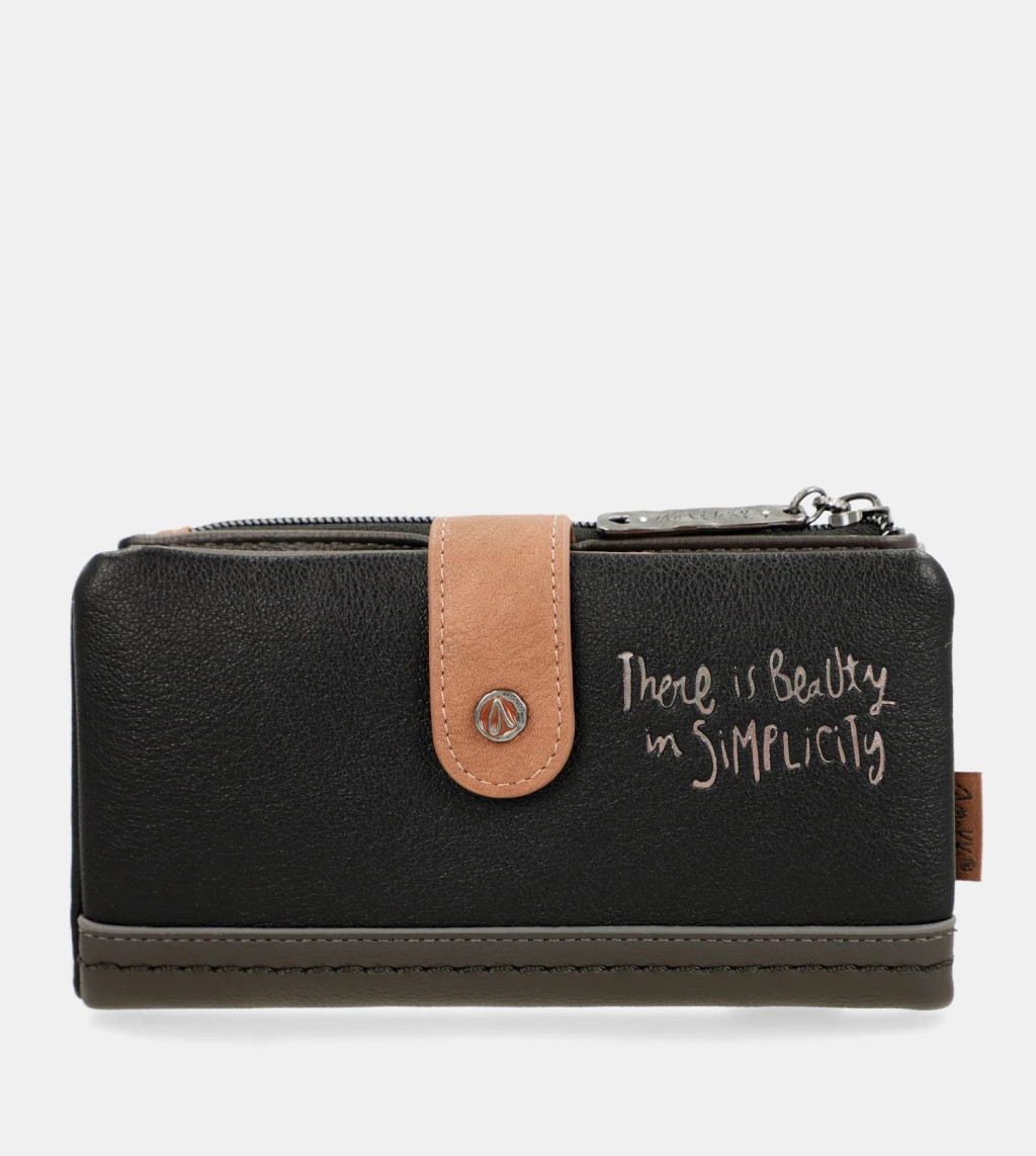 Ez egy nagy méretű pénztárca. Az anyag, amelyből készült, rugalmas. Két fő rekesze van: hátul, ahol egy nagy pénztárcát és helyet talál a számlák vagy dokumentumok számára. Felül cipzáros, belül pedig érméket tárolhatsz. Az egész belső tér bélelt.