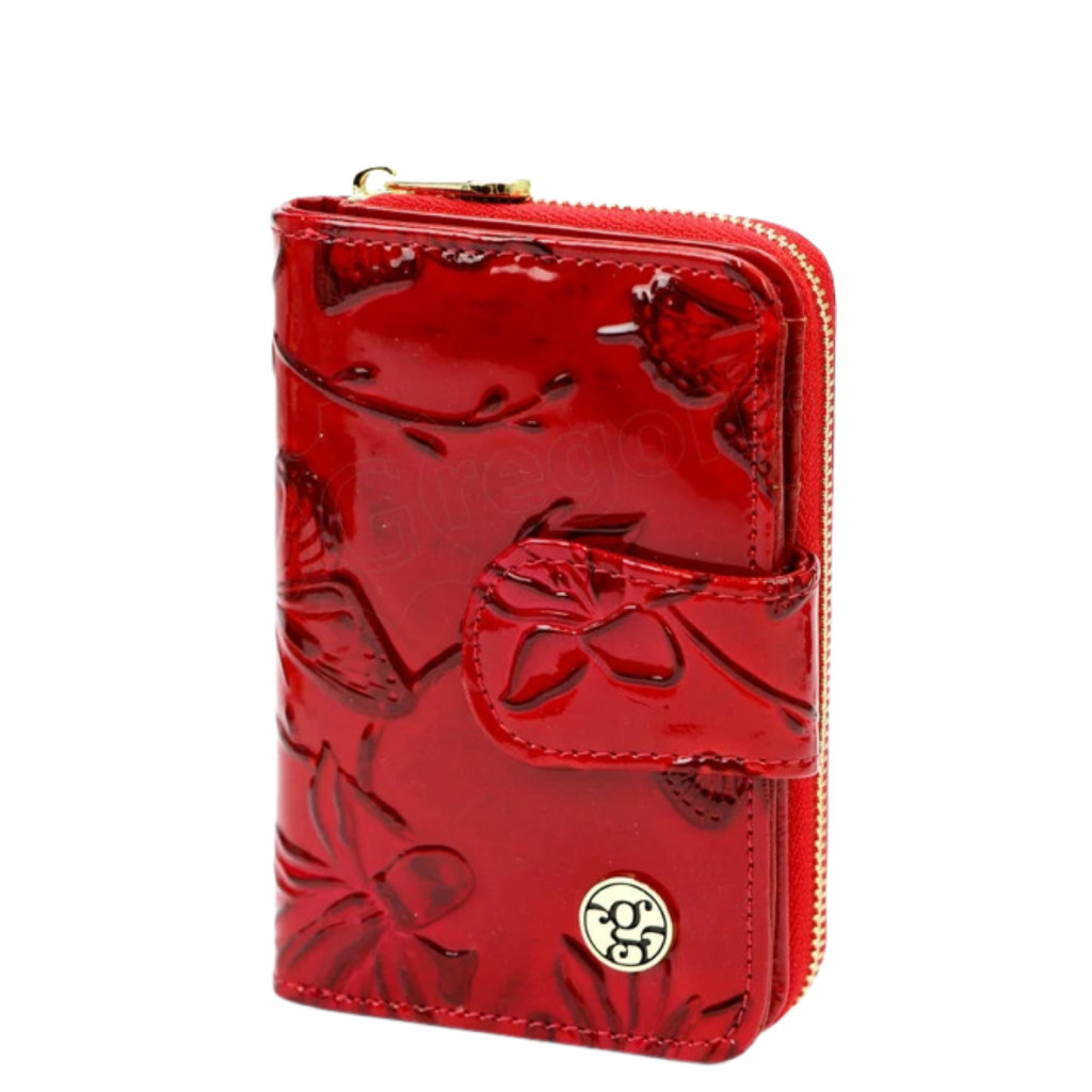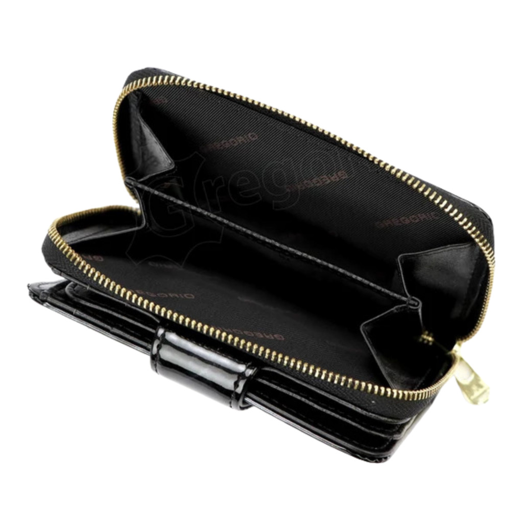 Gregorio lakk bőr női pénztárcaálló fazonpatentos fő rekesz1 rekeszes belül3 db rejtett zseb belül9 db kártyatartó belül1 db fényképtartó belül1 db irattartóhátulján cipzáras osztott aprótartóRFID védelemSzé:8 x Ma:13 x Mé:3 cm