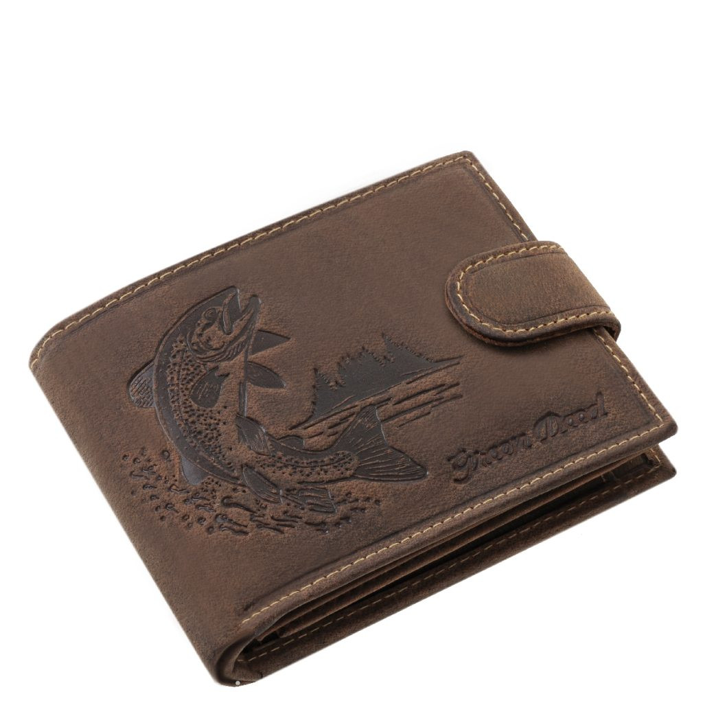 Pisztráng mintás horgász pénztárca, minőségi benyomással a fedelén, valódi bőr alapanyagból gyártott modell, masszív és stílusos díszdobozos kivitelben.