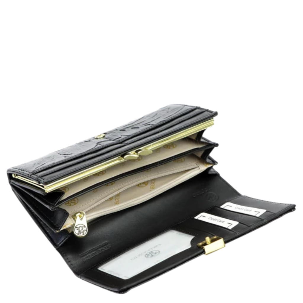 Gregorio bőr női pénztárcapatentos fő rekesz3 rekeszes belülkeretes osztott aprótartó1 db cipzáras zseb1 db rejtett zseb belül8 db kártyatartó belül1 db fényképtartó belülRFID védelemSzé:18 x Ma:9 x Mé:3 cm