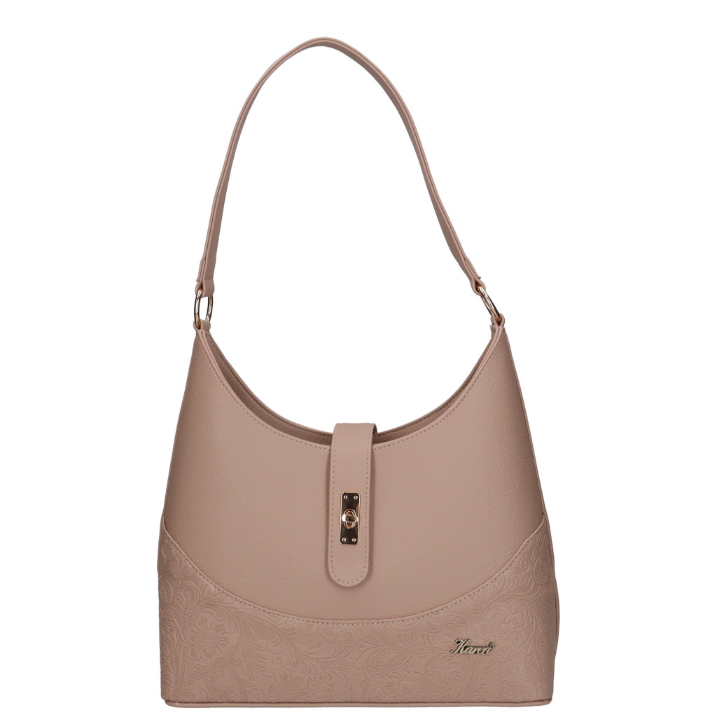 Karen rostbőr női válltáskaelegáns fazoncsatos áthajtócipzáras fő rekeszbelseje osztottcipzáras elválasztóvalbelül cipzáras zseb és mobiltartóhátulján cipzáras zsebalján fém védőtalpakvállpántja 56 cmSzé:32 x Ma:21 x Mé:11 cm