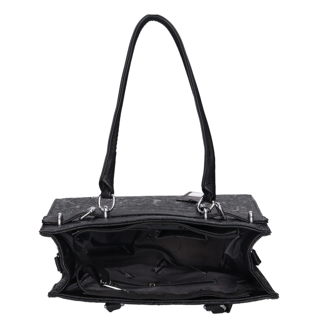 Karen rostbőr női válltáskaelegáns merev fazoncipzáras fő rekeszbelseje egyterűbelső cipzáros zseb és mobiltartóhátulján cipzáras zsebalján fémvédő talpakvállpántja: 57cmSzé:32cm Ma:25 Mé:12 cm