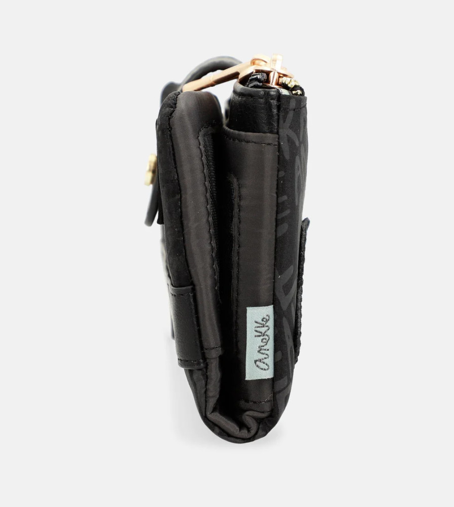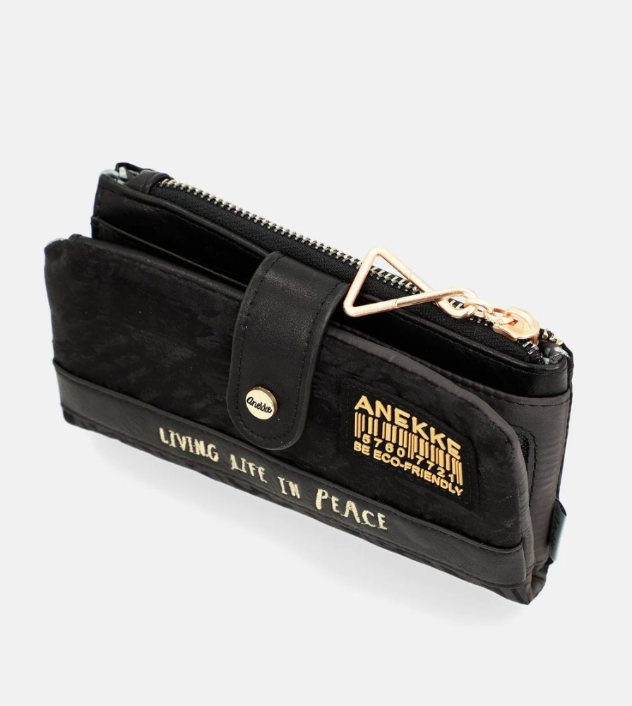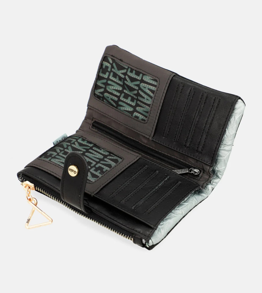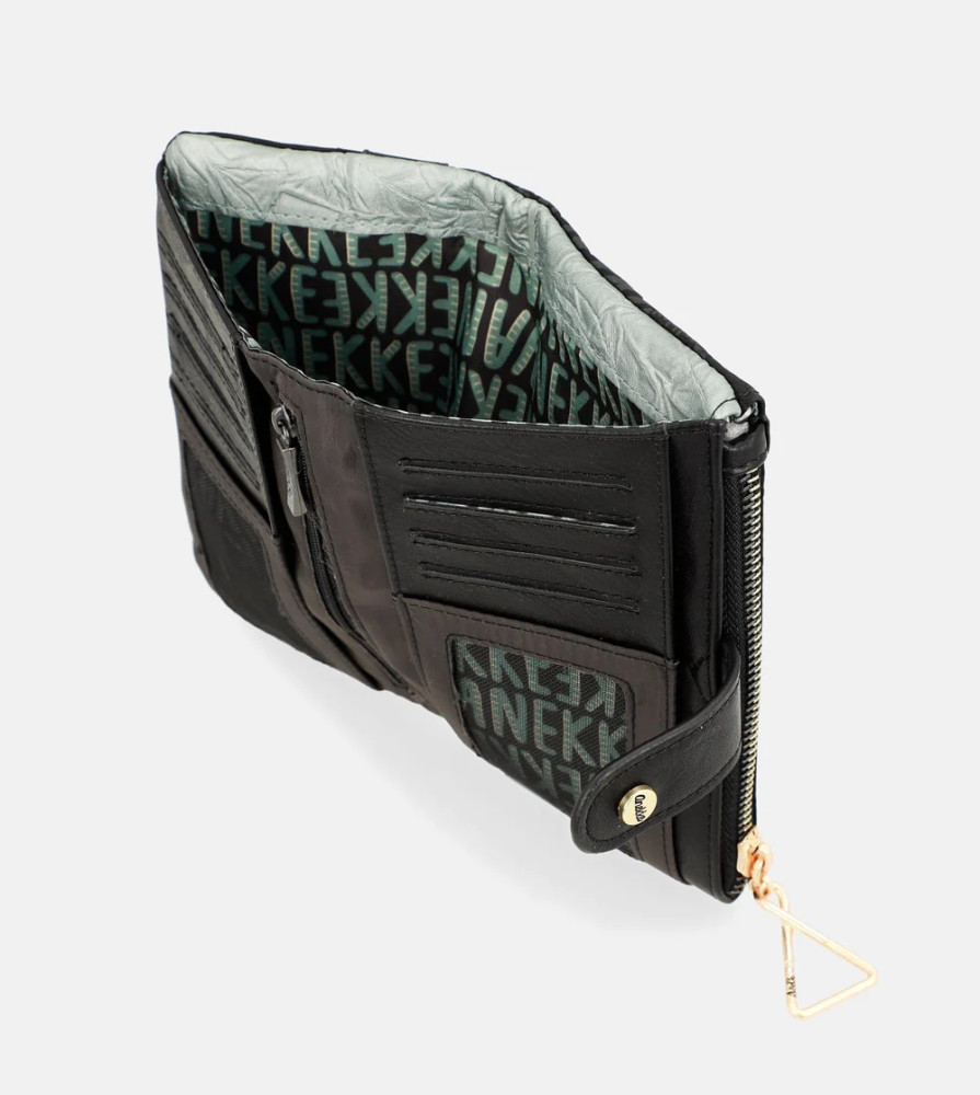 Anekke pénztárcaelején cipzáras aprótartóbelseje egyterűhátulján patentos fő rekeszbelül 9 db kártyatartóbelül 2 db fényképtartóbelül 1 db cipzáras zsebbelül 2 db rejtett rekeszbelül 1 db papírpénztartóRFID védelemmel ellátvaSzé:18x Ma:10x Mé:2 cm