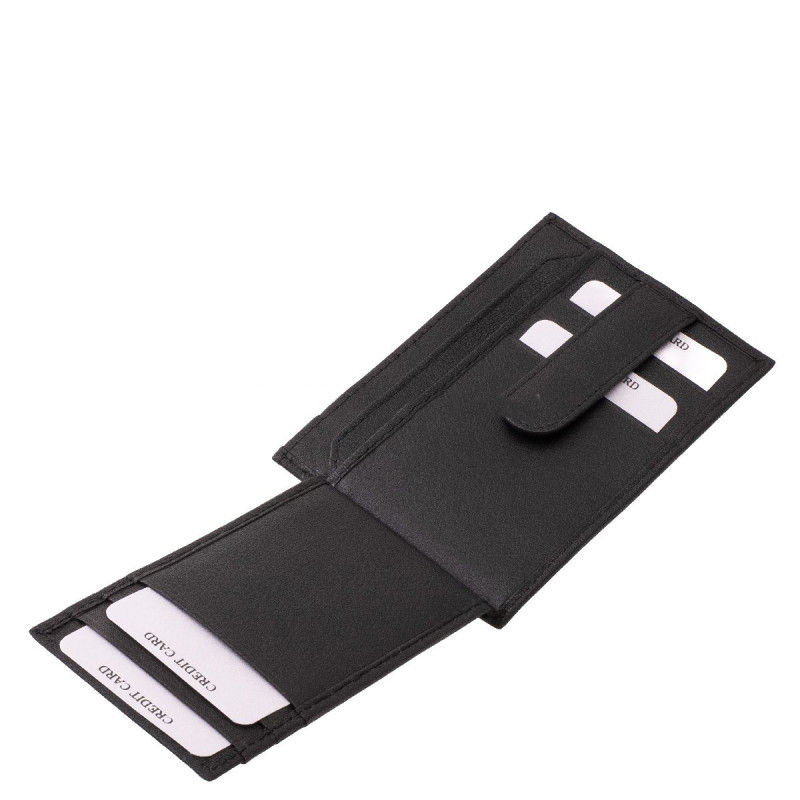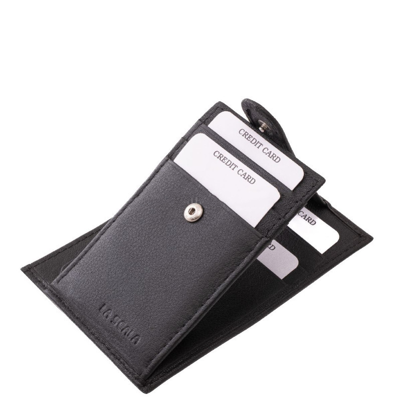 La Scala márkás, prémium minőségű valódi bőr, fekete színű, jól kihasználható, oldalra nyitható kártyatartó, irattartó hellyel, külső átkapcsolóval