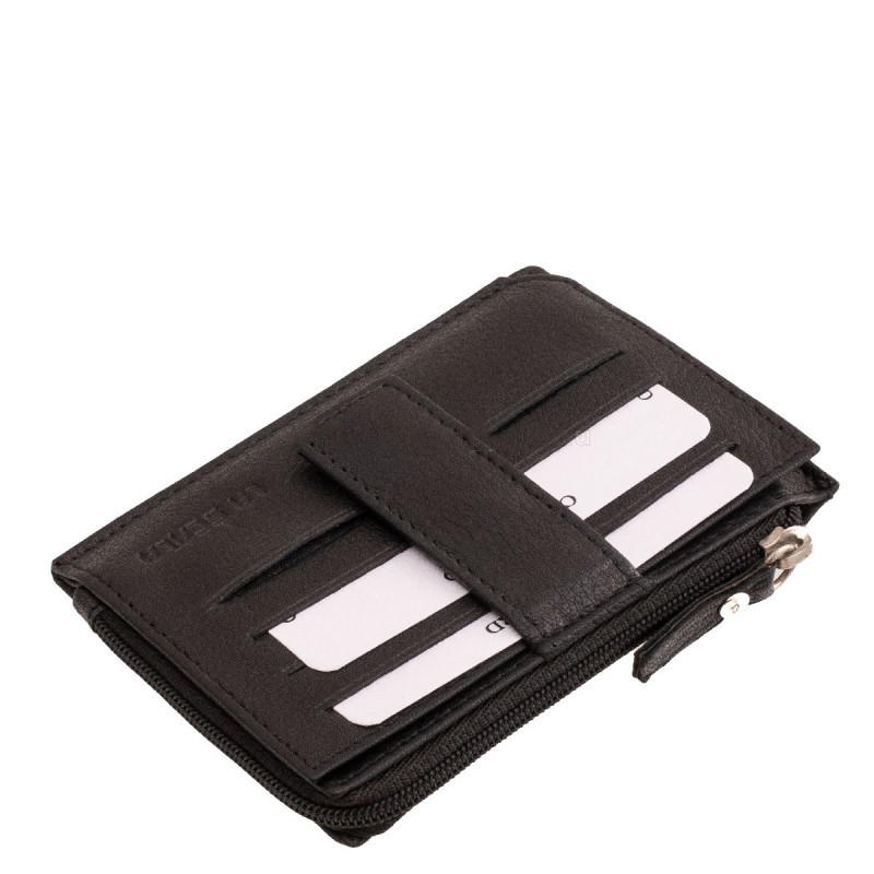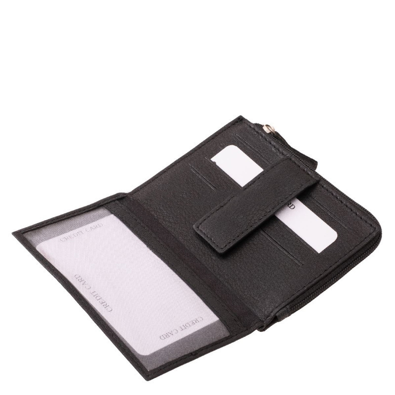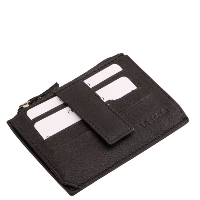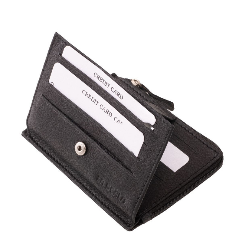 Fekete színű, praktikus, kézreálló, többfunkciós, kellemes tapintású valódi bőr, La Scala márkás, kártyatartó, cipzáras aprópénztartóval, patenttel zárható külső átkapcsolóval