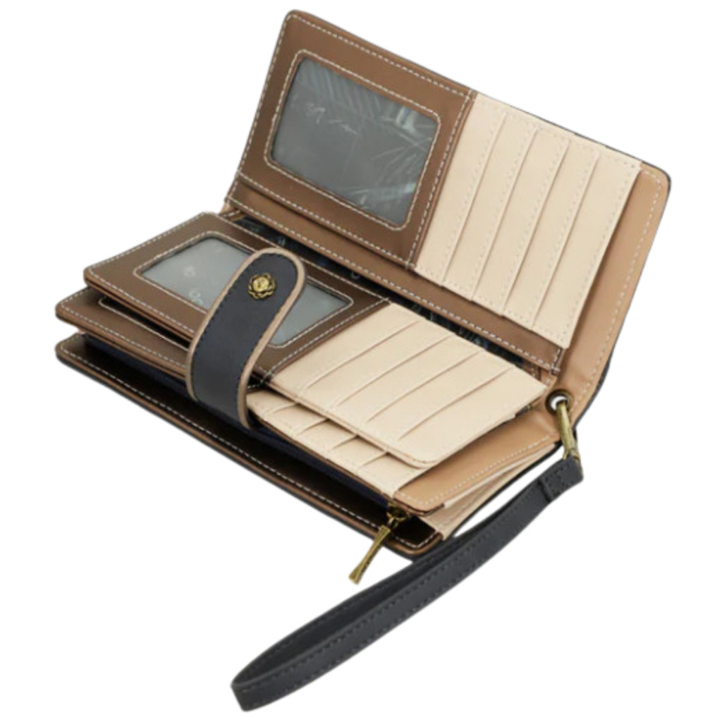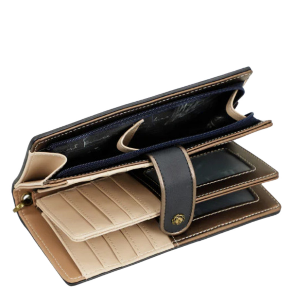 Anekke pénztárcafelül cipzáras osztott aprópénztartó hátulján patentos kártyatartó rekeszbelül 16 db kártyatartóbelül 4 db fényképtartóbelül 1 db papírpénztartó rekeszbelül 6 db rejtett rekeszRFID védelemSzé:18x Ma:10x Mé:3 cm