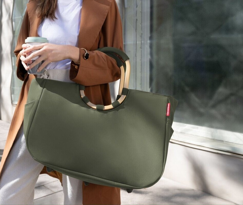Reisenthel Loopshopper Lnagy méretű bevásárlótáskaStílusos, elegáns és környezettudatos!kényelmesen párnázott alumínium foganytyúkvállon vagy kézben hordhatóbelül egy cipzáras zsebkét külső tároló zsebmerev alj talpakkalanyaga: víztaszító prémium poliészter, újrahasznosított PET palackból.Szé:46 x Ma:34,5 x Mé:25 cműrtartalma 25 l