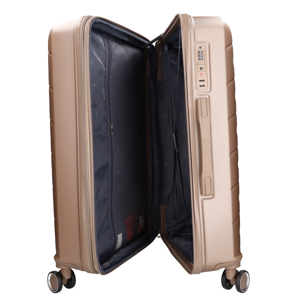 Benzi közepes méretű bőröndcipzárral bővíthetőegy hetes utazáshoz360 fokban finoman gördülő dupla kerekes, négykerekűkemény, ütésálló Polipropilén anyagbólháromjegyű számzárasbelül cipzáras térelválasztóállítható belső keresztpántokkis kézi fogantyú és teleszkópos, kétállásos húzókartetején és oldalán fix kézbefogó fogantyúSzé:40 x Ma:64 x Mé:26 cmSúlya: 3,4 kg